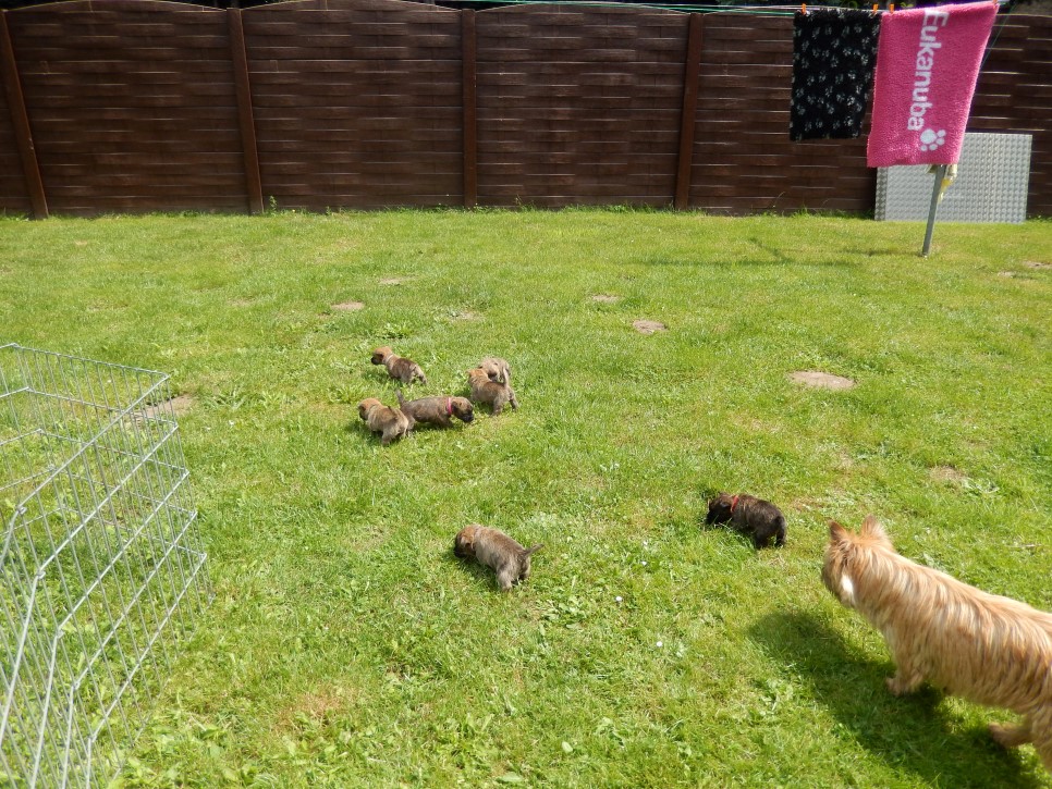 Begin maar af te tellen hoor, voor ons gaat het in ieder geval veel te snel. Ze worden gewoon met de dag schattiger. Ze zijn om op te eten die lieverdjes. Zondag zijn ze voor de tweede keer ontwormd en ze vinden het best wel lekker spul. Ze eten heel goed geweekte brokken al drie keer per dag en daarna natuurlijk nog het dessertje van mama wat maakt dat ze zeer goed bijkomen. De tandjes beginnen allemaal door te komen, dus bezoekers opgepast want ze zijn vlijmscherp hoor. Mijn tenen hebben er al ervaring mee. Voor de rest bekijk de foto’s en dan zie je dat ze heel levendig zijn.