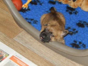 wij zijn ondertussen al terug in slaap gevallen na een heerlijke maaltijd en ons speeluurtje. We doen het heel goed. We spelen al veel meer en worden ook veel geknuffeld. Gisteren hebben we veel puppybezoek gehad. Eric en Nadine hadden hun petekindjes bij dus hebben we bij één van hen op schoot gezeten. Jessica en Liesbeth met Lars zijn ook langsgeweest en natuurlijk vonden zij ons weer heel knuffelig en zijn we allemaal eens opgepakt geweest. Daarna hebben we nog heel fijn buitengespeeld met vooral zus Lacey. Vandaag hebben we alleen maar foto’s van als we aan het slapen zijn.