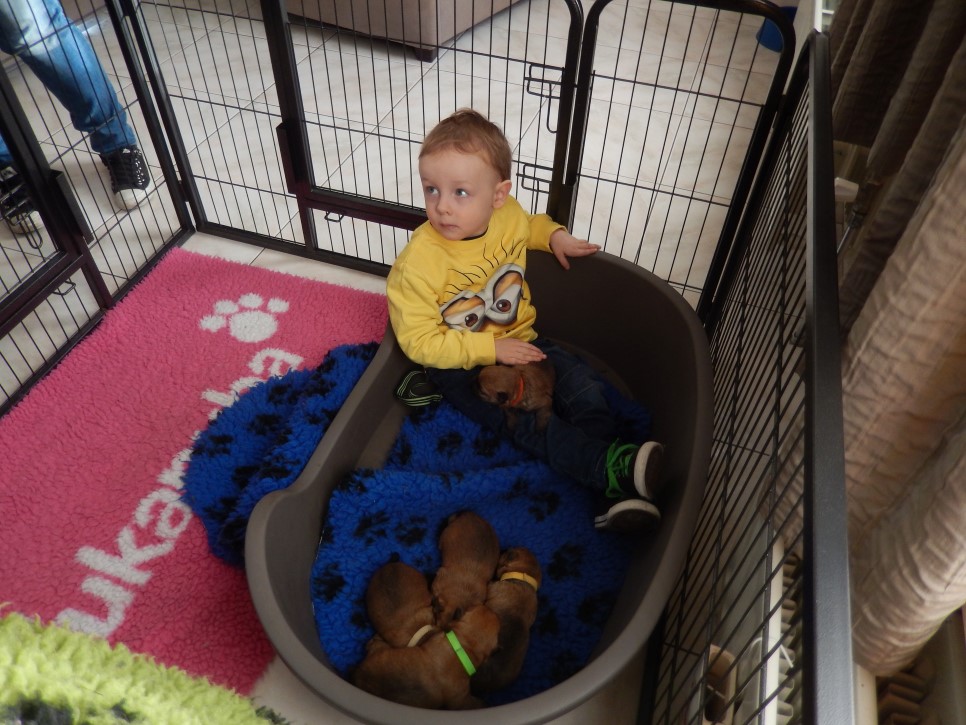 Hier zijn we weer en ja in een nieuw jaar. Ozzy wil nog steeds niet kijken. Hij heeft schrik van de dames denk ik, maar ze zien er ook zo beeldig uit alhoewel Ozzy niet voor hun moet onderdoen en er evenzeer fantastisch uitziet. Vandaag waren de kleinkinderen op bezoek en Wyatt vindt als de pupjes beginnen kruipen en de oogjes open zijn dat hij er toch wel even bij moet zitten. Nadat hij zijn handjes dus ontsmet had mocht hij van ons toch in de ren gaan zitten en hij ging er liefst zo kort mogelijk bij. Het was zo schattig om te zien hoor. Natuurlijk moest mijn metekindje Alexander er dan ook wel even bij hé. Hier moeten de kleintjes met de puppy’s en de honden groot worden. Ik zou dus zeggen geniet van deze prachtige foto’s van al onze kleine schatten “puppy’s en kids”.